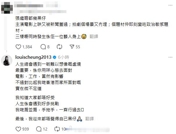 明报:《金童》及新剧遇阻滞 张继聪:从来不觉得自己倒霉张继聪主演的《金童》在上月21日上映,截至25日票房已逾300万,阿聪原定到戏院谢票,惟上周三发生大埔宏福苑五级火,有关宣传活动要暂停,加上阿聪有份参演的ViuTV剧集《小业主战线》,疑火灾前曾向宏福苑借场拍摄,有报道指剧集已开工一个多星期,张继聪接受传媒查询时表示:“这些事情不如你问回ViuTV,我一个演员不方便答。”有网民今早(4日)社交平台发文直指阿聪很倒霉:“主演电影上映又被新闻盖过;拍剧那个场景又没了;那个题材还立刻变成了政治敏感题材。三样事情同时发生在他一位艺人身上。”及后阿聪回应该网民:“人生总会遇到一些难以想像的处境,最重要,是你用什么心态去面对,电影,工作,当然有影响,不过对比起我们香港现在所面对的,实在微不足道,我知道大家都不好受,人生是会遇到好多挑战,我们肩并肩,手拖手,一起走过去,最后,我从来都不觉得自己倒霉。”