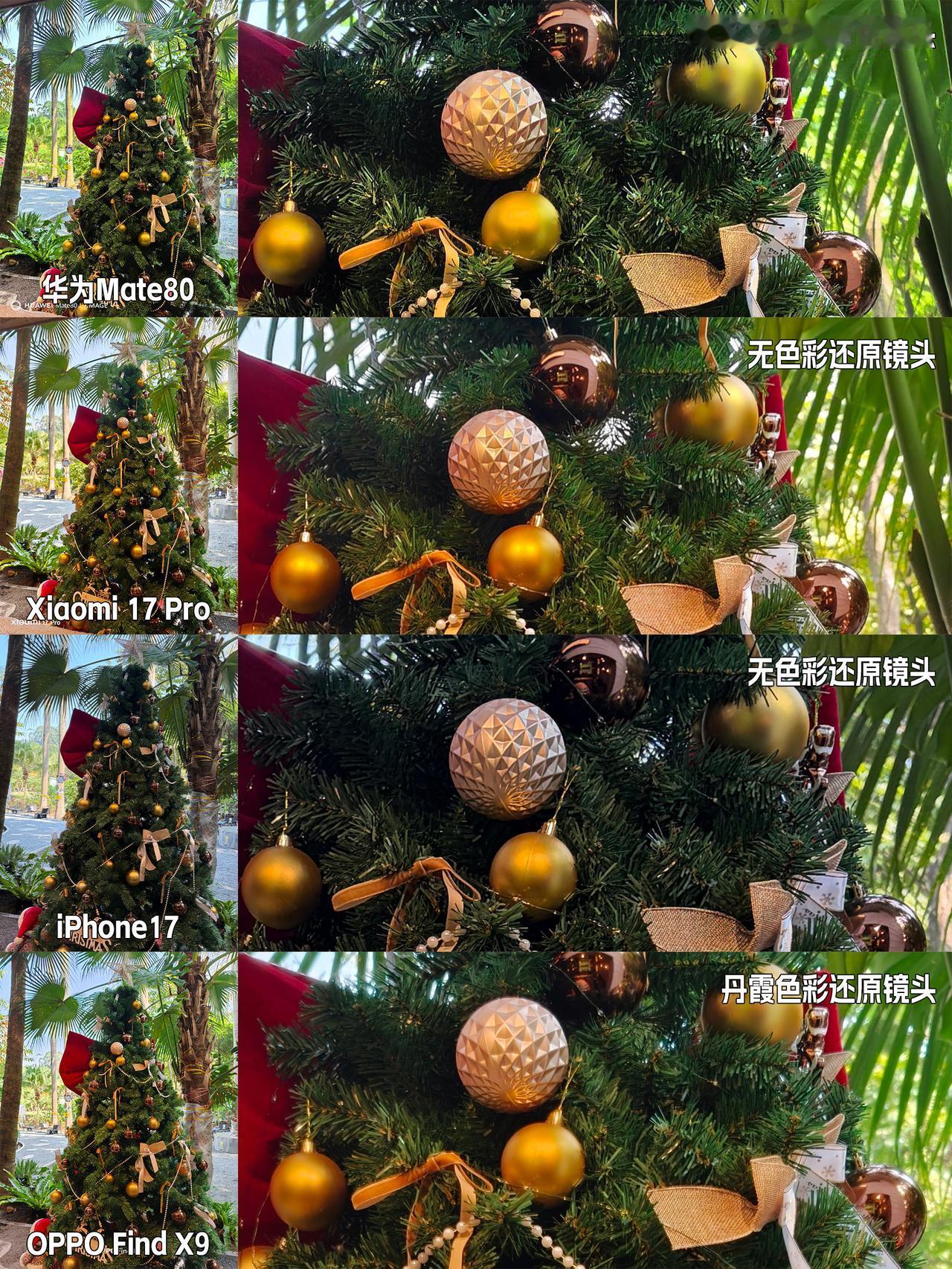中杯旗舰拍圣诞美照丨🎄谁的风格更出彩? 都说圣诞节的氛围感全靠色彩烘托!四款热门中杯旗舰实拍效果对比出炉📸,大家觉得谁家拍得色彩更还原呢? ✅华为Mate 80: 将门店的暖色光和绿色的圣诞树还原相当到位,画面亮但不过曝,暗部也不会糊一片 ✅小米17 Pro: 自带徕卡影调,画面饱和度和对比度较高,暗部细节保留不错,适合喜欢强烈视觉冲击力的用户。 ✅iPhone 17: 白平衡控制出色,但色彩稍显寡淡一些,想要有节日氛围感,直出可能需要后期稍微提亮或调暖。 ✅OPPO Find X9: 整体色彩很接近肉眼所见,第一组中圣诞老人的正红色看着更加鲜活和第二组中圣诞树也更翠绿抢眼,而且画面不会特别强调对比度,所以拍咖啡馆的灯光那类环境,会显得很温柔,氛围感轻松拿捏。 单纯就这两组样张来看,华为和OPPO真的太懂圣诞了,一个有二代红枫原色镜头,一个有丹霞色彩还原镜头,在对圣诞节核心的红、绿等色彩的把控上,明显要比无色彩镜头的机型还原得更准更鲜活,不用后期调色,氛围感直接焊在照片里~有你在用的同款旗舰吗?😏 圣诞节 圣诞拍照 中杯旗舰手机 华为Mate80 OPPOFindX9 iPhone17 小米 17Pro 手机拍照对比