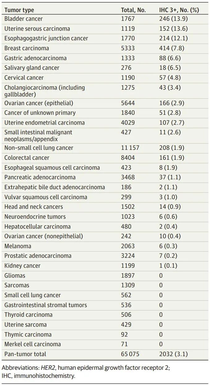 近日,JAMAOncology在线发表了一项大规模真实世界研究的简报,分析了超过65,000例实体瘤患者的HER2IHC检测数据,系统揭示了HER2IHC3+在不同瘤种中的阳性率及分布情况[1]。该研究为理解HER2在泛瘤种中的表达谱提供了重要流行病学参考,也为未来优化生物标志物检测策略、推动精准诊疗实践带来启示。此类大规模真实世界证据也有助于识别可能从后续更精细分子分型中获益的瘤种,为构建更高效的临床检测路径奠定基础。本文对该研究的主要内容进行梳理和概述,以期为相关领域临床工作者提供参考。