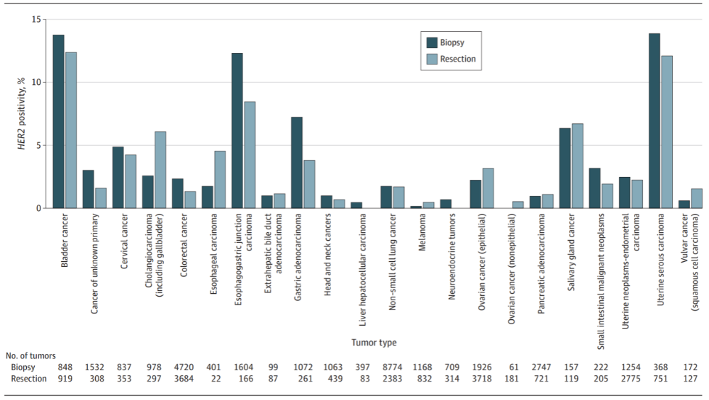 此外,研究还比较了在非乳腺癌肿瘤中,采用胃腺癌活检标本与切除标本判读标准进行判读的结果。数据显示,在阳性率≥0.4%的非乳腺肿瘤中,对于大多数肿瘤类型,基于活检标本与基于切除标本得出的HER2IHC3+阳性率基本相似(图1)。