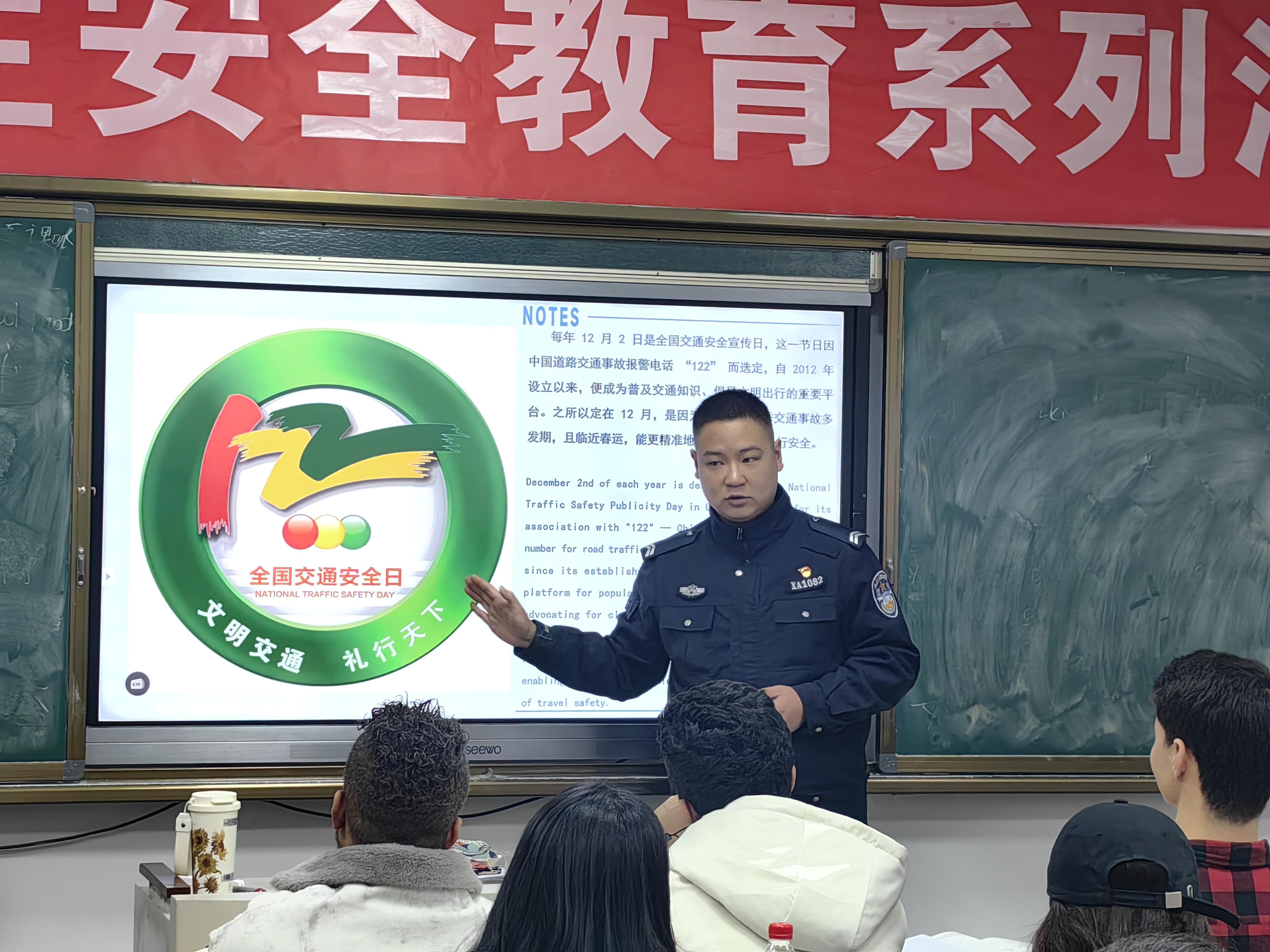 12月4日,交管雁塔大队长延堡中队中队长牛伟带领宣传专干走进陕西师范大学国际学生课堂,讲授了一堂生动深刻的交通安全普法课。活动中,易阳警官用通俗的语言和直观的案例,对相关法律规定中与留学生日常出行密切相关的条款进行重点阐释。针对常见交通违法行为,通过图文结合和播放警示视频的方式,详细解析了酒驾、醉驾、闯红灯、逆行、骑行电动自行车不戴头盔等行为的法律后果与安全隐患,帮助他们熟悉本地交通规则、安全便捷出行,筑牢交通安全防线。