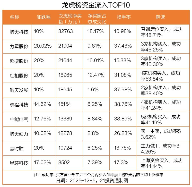 49只上榜的龙虎榜个股中,25只个股被净买入,24只个股被净卖出。其中,资金净买入最多的是航天科技,达3.28亿元,占总成交金额的18.17%。航天科技当日收盘上涨10%,换手率为10.98%。