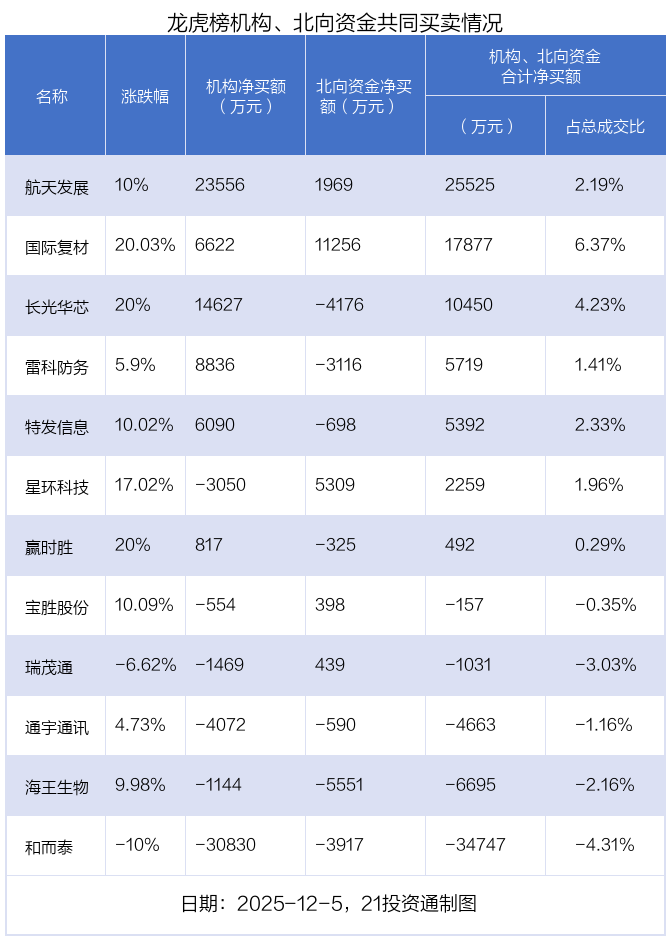 值得注意的是,机构和北向资金共同净买入了国际复材、航天发展等2股;共同净卖出了通宇通讯、和而泰、海王生物等3股;在星环科技,瑞茂通,宝胜股份,赢时胜,特发信息,雷科防务,长光华芯上出现分歧,机构净卖出星环科技3050.15万元,北向资金净买入5308.87万元;机构净卖出瑞茂通1469.45万元,北向资金净买入438.69万元;机构净卖出宝胜股份554.49万元,北向资金净买入397.61万元;机构净买入赢时胜817.36万元,北向资金净卖出325.06万元;机构净买入特发信息6089.96万元,北向资金净卖出697.92万元;机构净买入雷科防务8835.73万元,北向资金净卖出3116.4万元;机构净买入长光华芯1.46亿元,北向资金净卖出4176.19万元。