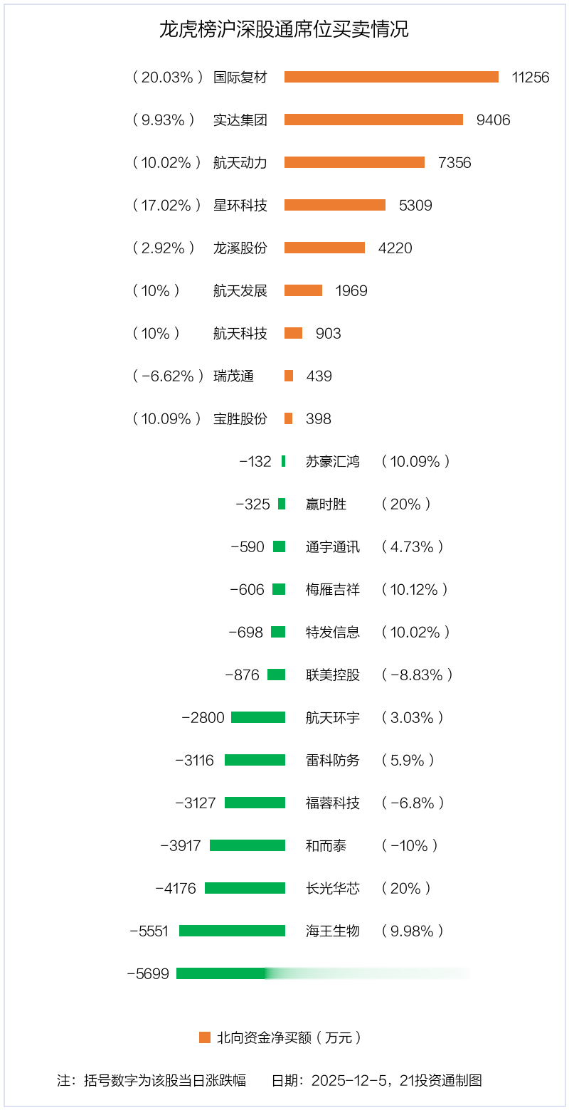 12月5日,北向资金参与龙虎榜中的个股共有22只,合计净买入9641.04万元。其中沪股通净买入6股,净卖出7股,合计净买入9712.25万元;深股通净买入3股,净卖出6股,合计净卖出71.21万元。