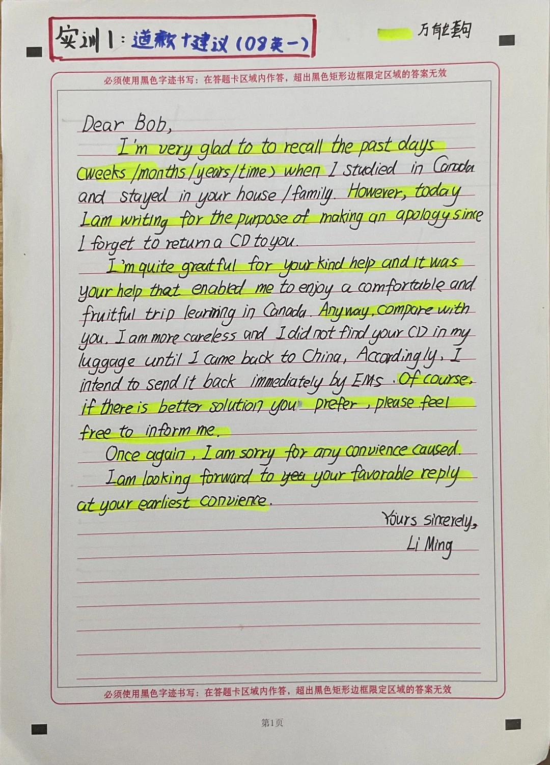 精讲1:辞职+道歉(05英一) 实训1:道歉+建议(08 英一)