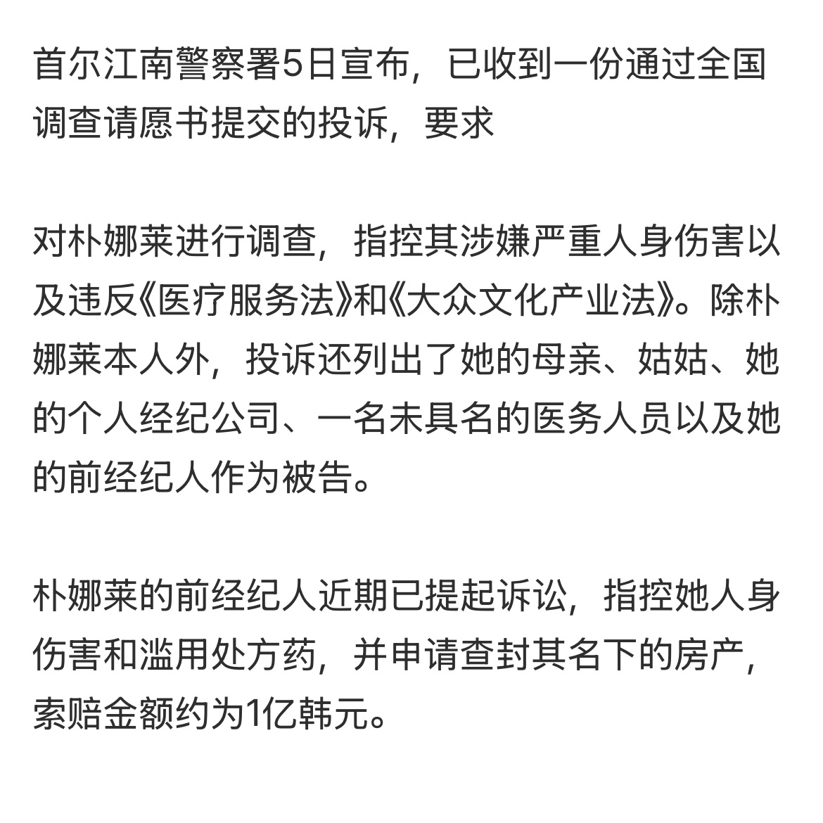 朴娜莱因霸凌经纪人被警方立案调查朴娜莱霸凌经纪人被立案调查