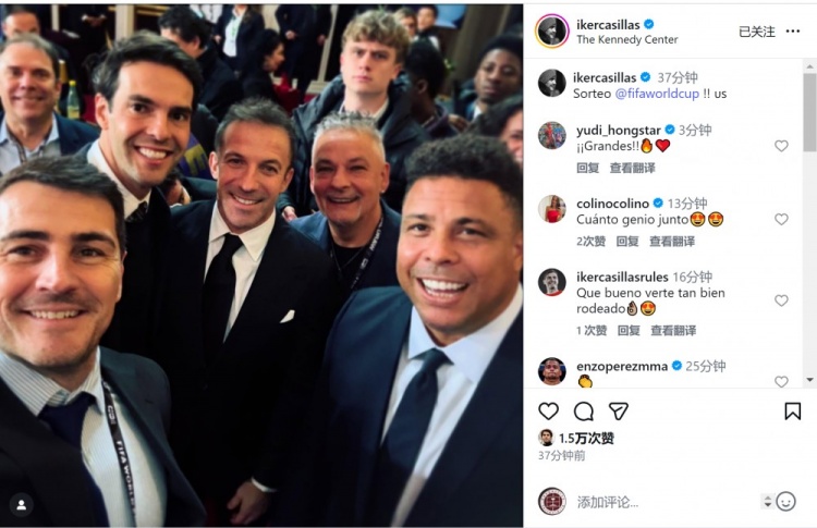 卡西出席世界杯抽签仪式,他在社交媒体上晒出与大罗、卡卡、皮耶罗、巴乔的合照。
