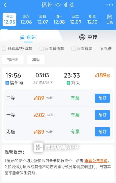 铁路部门官方发布的信息及铁路12306平台查询的结果显示,此次开行的宁波至汕头D3113次动车组列车,运行时刻已明确。列车于15时52分从宁波站始发,19时52分经停福州南站,随后依次途经福清、涵江、莆田、泉州、厦门北、潮汕等站点,最终于23时33分抵达汕头站。其中,福州南站至汕头站段运行时长约3小时40分,二等座票价为189元。