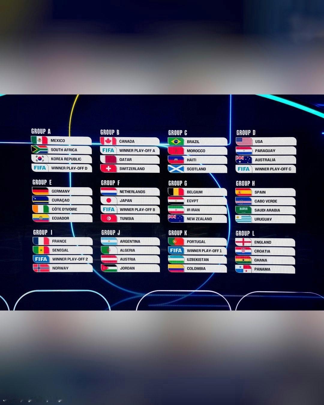 当地时间12月5日(周五),2026世界杯分组抽签仪式在美国华盛顿肯尼迪中心举行,美墨加三国领导人与国际足联主席因凡蒂诺共同出席,抽签结果如下: A组:墨西哥、南非、韩国、欧洲区附加赛D队(丹麦/北马其顿/捷克/爱尔兰); B组:加拿大、欧洲区附加赛A队(意大利/北爱尔兰/波黑/威尔士)、卡塔尔、瑞士; C组:巴西、摩洛哥、海地、苏格兰; D组:美国、巴拉圭、欧洲区附加赛C队(土耳其/罗马尼亚/斯洛伐克/科索沃)、澳大利亚; E组:德国、库拉索、科特迪瓦、厄瓜多尔; F组:荷兰、日本、欧洲区附加赛B队(乌克兰/瑞典/波兰/阿尔巴尼亚)、突尼斯; G组:比利时、埃及、伊朗、新西兰 H组:西班牙、佛得角、沙特阿拉伯、乌拉圭; I组:法国、塞内加尔、洲际附加赛2队(玻利维亚/苏里南/伊拉克)、挪威; J组:阿根廷、阿尔及利亚、奥地利、约 旦; K组:葡萄牙、洲际附加赛1队(新喀里多尼亚/牙买加/民主刚果)、乌兹别克斯坦、哥伦比亚; L组:英格兰、克罗地亚、加纳、巴拿马