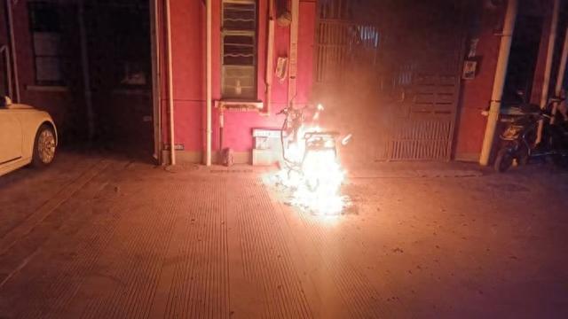 12月2日凌晨,张堰一小区楼栋门口停放的电动自行车着火