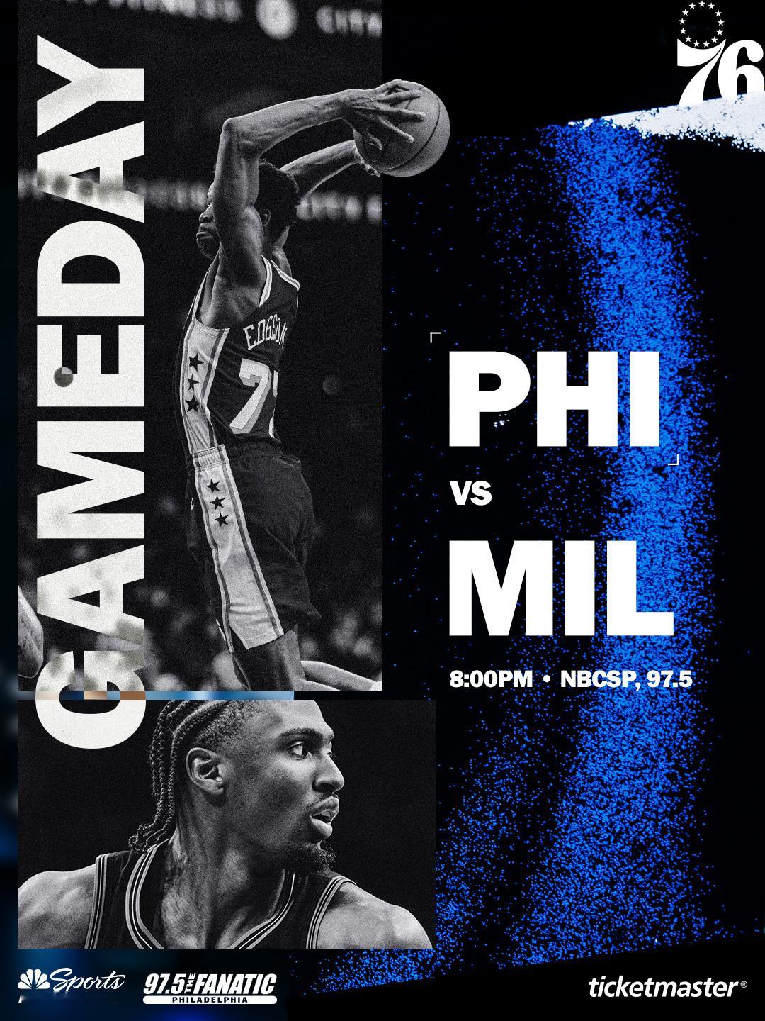 常规赛第22场:76人vs雄鹿首发阵容名单:马克西、埃奇库姆、乔治巴洛、德拉蒙德