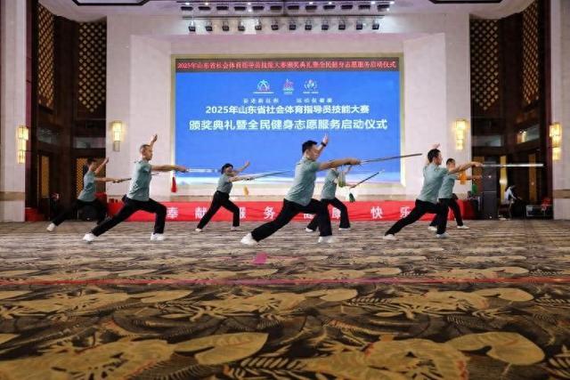 图为山东省社会体育指导员技能交流展示大赛颁奖典礼暨山东省全民健身志愿服务启动仪式现场。