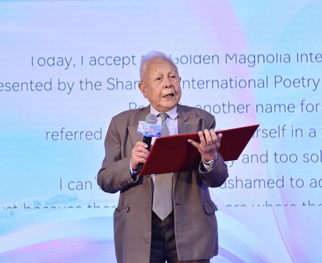 本届“金玉兰”诗歌大奖授予中国著名诗人、北京大学教授谢冕。年逾九旬的谢冕在获奖感言中深情回忆起诗歌伴随自己走过的岁月。他特别提到,站在上海西岸的游船上眺望江景,看着来自不同国家的诗人共同沉醉于诗意之中,更深刻体会到上海西岸作为国际文化交流平台的独特价值,“我从来没有获得诗人的荣誉,是上海鼓励了我,给了我殊荣。”