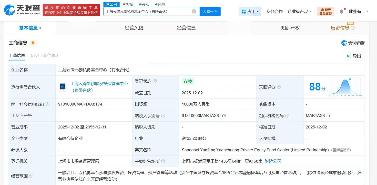 天眼查工商信息显示,近日,上海云锋元创私募基金中心(有限合伙)成立,执行事务合伙人为上海云锋新创股权投资管理中心(有限合伙),出资额1亿人民币,经营范围为以私募基金从事股权投资、投资管理、资产管理等活动。股权全景穿透图显示,该基金中心由黄鑫、上海云锋新创股权投资管理中心(有限合伙)共同出资,其中,上海云锋新创股权投资管理中心(有限合伙)由马云出资约40%。
