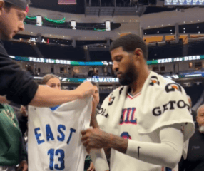 赛后,76人在官方社媒发布了一段视频,内容是保罗-乔治为雄鹿主场球迷带来的2016年他自己的全明星球衣签名,76人官方配文道:“2016年全明星赛球衣也太顶了!respect!”