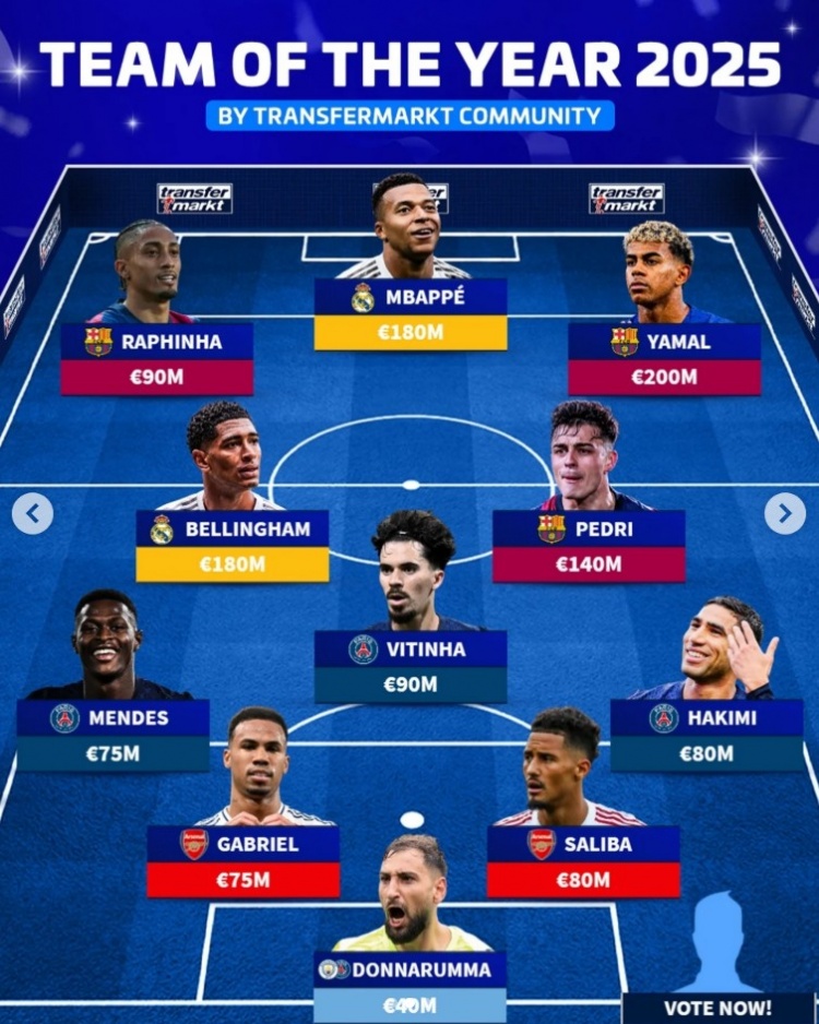 直播吧12月6日讯德转此前发起2025年度最佳阵容投票,目前11人球员最佳阵已经出炉,只剩最佳主帅尚空缺,以下为最佳阵容情况: