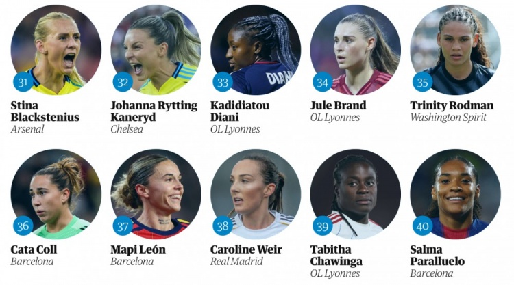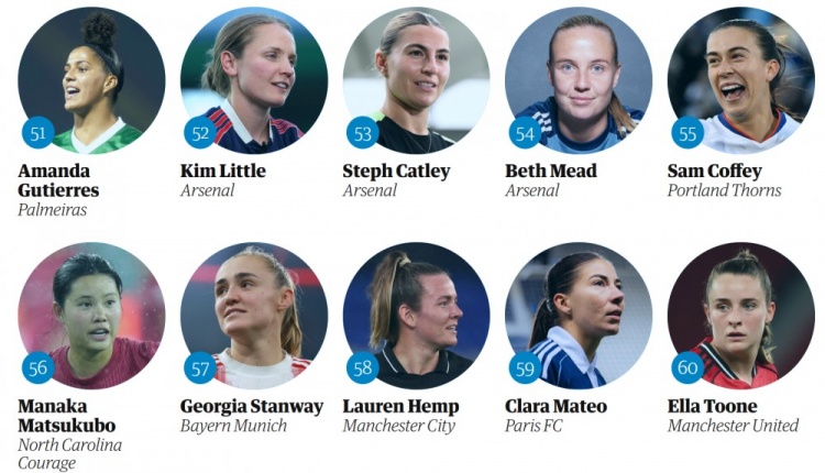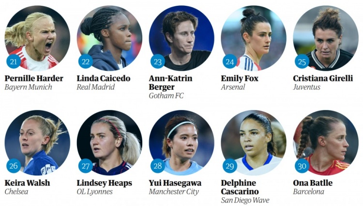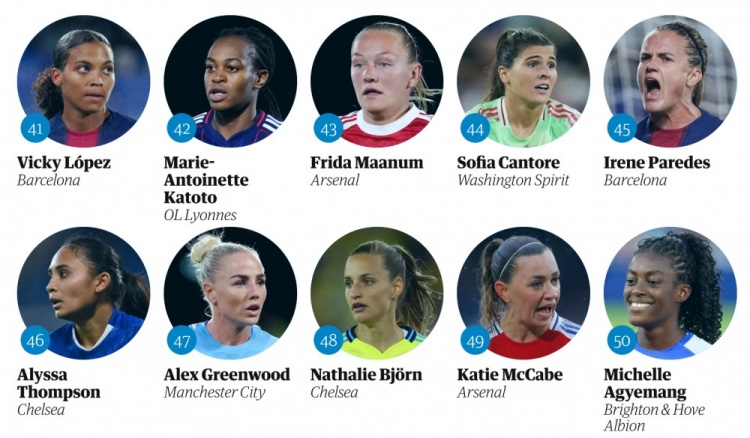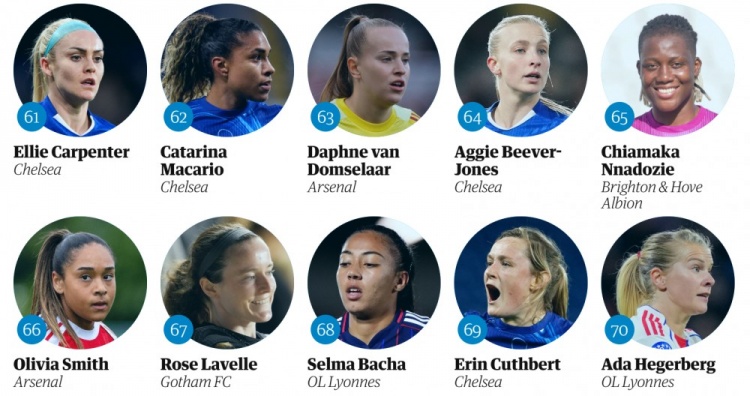 61-70位:卡彭特(切尔西)、卡塔琳娜·马卡里奥(切尔西)、范多姆塞拉尔(阿森纳)、阿吉·比弗-琼斯(切尔西)、奇亚马卡·纳多齐(布莱顿)、奥利维亚·史密斯(阿森纳)、罗斯·拉维尔(哥谭FC)、巴查(里昂)、艾琳·库斯伯特(切尔西)、阿达·海格伯格(里昂)