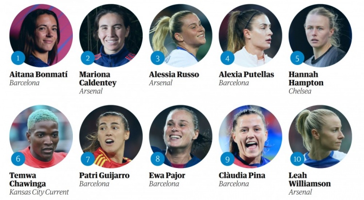 1-10位:邦马蒂(巴萨)、马里奥娜·卡尔登泰(阿森纳)、鲁索(阿森纳)、普特拉斯(巴萨)、汉娜·汉普顿(切尔西)、特姆瓦·查温加(堪萨斯城)、吉哈罗(巴萨)、埃瓦·帕乔尔(巴萨)、克劳迪娅·皮纳(巴萨)、莉娅·威廉姆森(阿森纳)