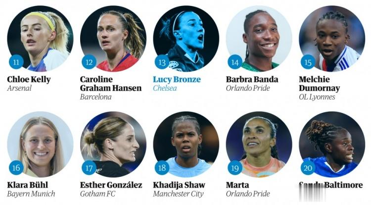 11-20位:凯莉(阿森纳)、卡罗琳·汉森(巴萨)、布隆泽(切尔西)、班达(奥兰多荣耀)、杜莫奈(里昂)、克拉拉·比尔(拜仁)、埃斯特·冈萨雷斯(哥谭FC)、卡迪贾·肖(曼城)、玛塔(奥兰多荣耀)、巴尔的摩(切尔西)
