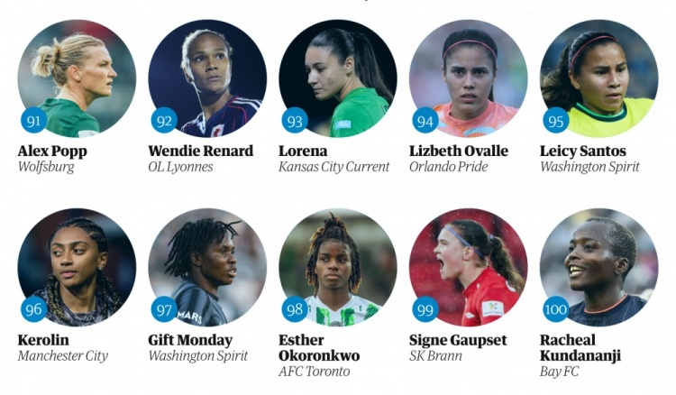 91-100位:亚历克斯·波普(沃尔夫斯堡)、雷纳德(里昂)、洛雷娜(堪萨斯城)、奥瓦勒(奥兰多荣耀)、莱西·桑托斯(华盛顿精神)、科罗琳(曼城)、芒迪(华盛顿精神)、奥科隆科沃(多伦多)、高普塞特(布兰)、昆达南吉(海湾FC)