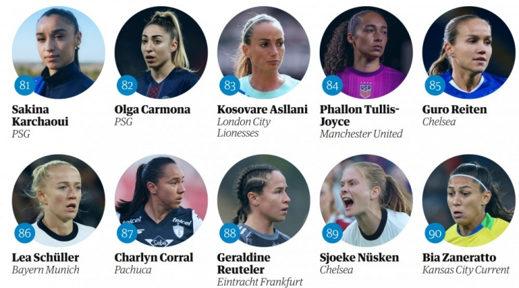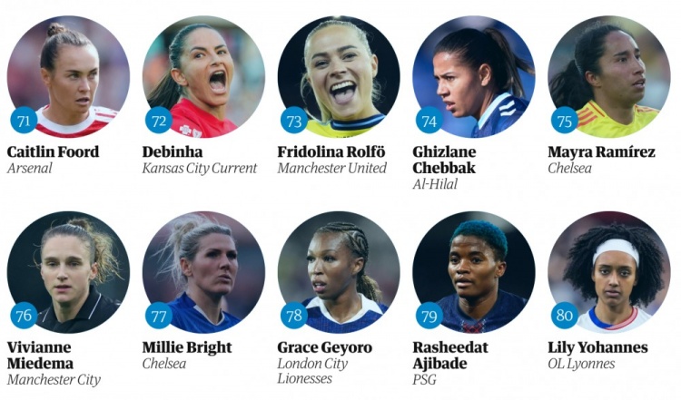 71-80位:凯特琳·富德(阿森纳)、德比尼亚(堪萨斯城)、罗尔弗(曼联)、切巴克(利雅得新月)、玛雅·拉米雷斯(切尔西)、米德玛(曼城)、米莉·布莱特(切尔西)、格蕾丝·盖约罗(伦敦城雌狮)、阿吉巴德(巴黎圣日耳曼)、莉莉·约翰尼斯(里昂)