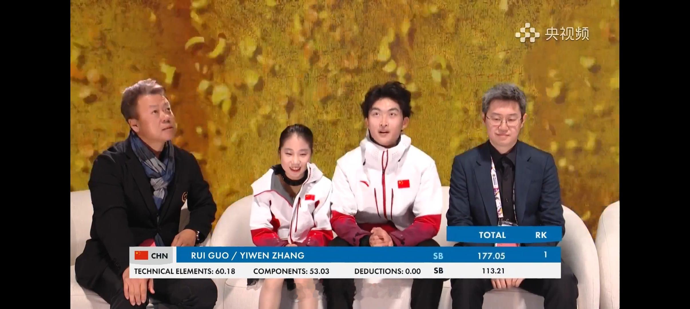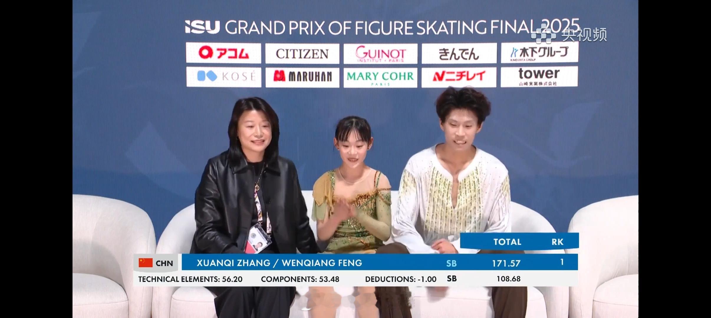 2025花样滑冰大奖赛总决赛 青年组双人自由滑🥇🇨🇳郭蕊/张益文自由滑113.21分(60.18+53.03),总分177.05分,刷新个人自由滑和总成绩历史最高分,首次获得大奖赛总决赛青年组双人滑冠军,继去年张嘉轩/黄一航后中国队蝉联总决赛青年组双人滑冠军,成为隋文静/韩聪、于小雨/金杨和张嘉轩/黄一航后中国第四队获得大奖赛总决赛青年组双人滑冠军组合🥈🇨🇳张轩绮/丰闻强自由滑108.68分(56.20+53.48-1),总分171.57分,刷新个人自由滑历史最高分,首次登上大奖赛总决赛青年组双人滑领奖台,中国队首次包揽大奖赛总决赛青年组双人滑冠亚军🥉🇨🇦坎普/埃利扎罗夫自由滑103.64分(51.57+54.07-2),总分166.46分4.🇨🇦德斯罗彻/瑟拉舍自由滑108.45分(54.27+54.18),总分162.90分,刷新个人自由滑和总成绩历史最高分5.🇨🇳陈雨萱/董胤博自由滑97.39分(50.58+46.81),总分153.02分,刷新个人总成绩历史最高分6.🇨🇦夸特罗基/拉卡斯自由滑93.23分(43.76+49.47),总分145.11分