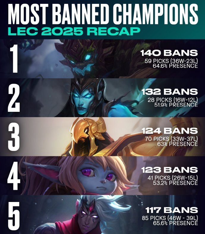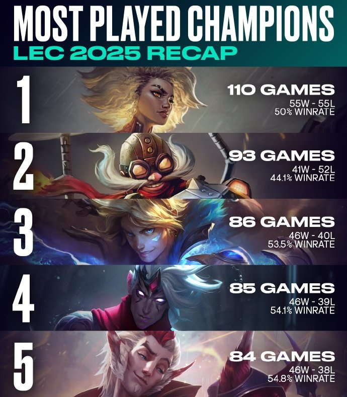 LEC2025赛季回顾:选用最多的英雄芮尔&被禁最多的英雄大树