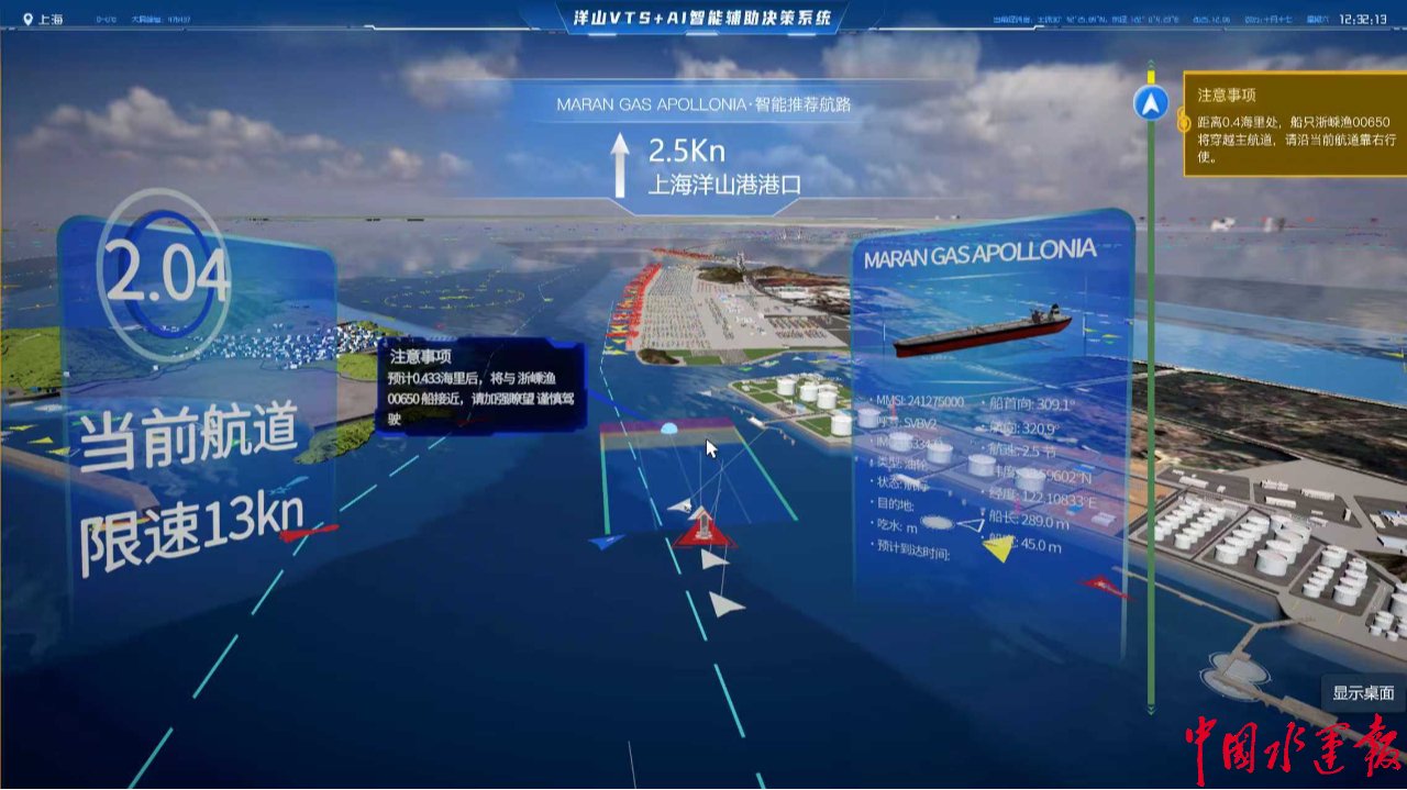 上午10时15分,“阿波罗尼亚”轮航经黄泽洋灯船,进入洋山港主航道。在其进港全程,洋山港海事局自主研发的人工智能系统“VTS精灵”开启实时智慧导航模式,通过整合多源数据、智能感知航行环境、自动生成航行建议,为船舶提供从航路选择、航速调整到风险预警的全链条数字化导航支持,实现了对重点船舶的全程、动态、精准监护。