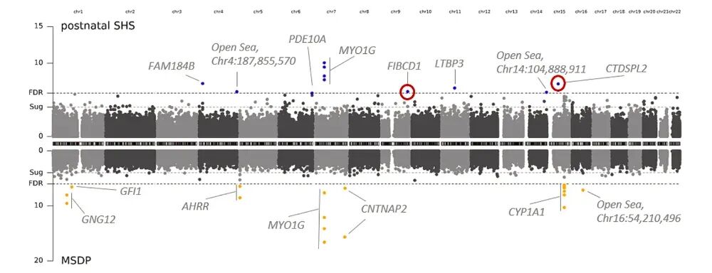 “烟雾痕迹”。这些点在图中的上半部分以蓝点的形式突出显示,其中两个是科学界从未见过的新标记。下半部分的橙点是大家熟悉的孕期吸烟带来的变化,用来说明分析是可靠的。这张基因地图得以让我们直观地看到烟雾在孩子体内留下的痕迹在哪里。