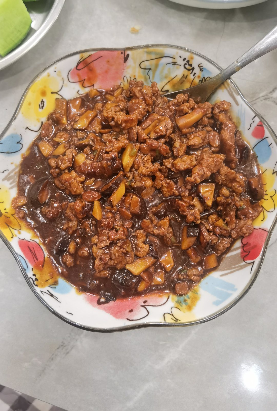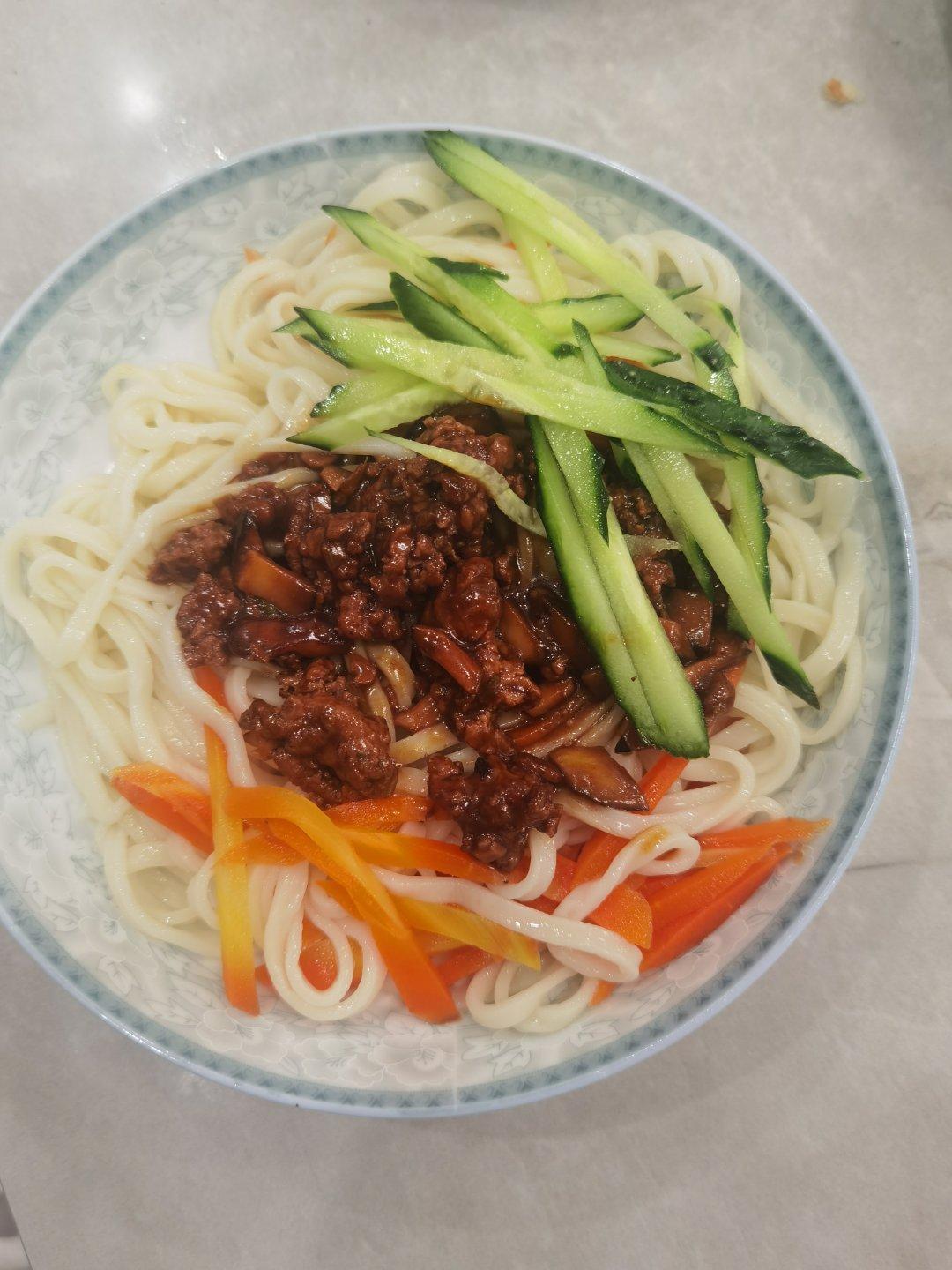 太赶落了,还是面条,炸酱的肉切的大小不一,黄瓜丝也切成黄瓜条了
