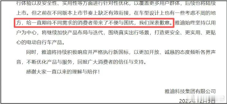 新国标被喷,雅迪急了!新国标电动车被喷到刷屏,雅迪紧急道歉。事情的导火索,是雅迪赶着新国标热度推出一款“毛豆”单人版电动车,可这车一亮相就让网友炸了锅,一些直播带货现场,主播对着新车滔滔不绝,但弹幕里却满是质疑声音——“咋没有储物空间?雨衣跟充电器往哪放?带孩子怎么办?买瓶水都得揣兜里!这哪是新国标车,分明是共享电动车换了个标,人家共享车好歹还有车篮呢......”本来想着蹭新国标的热度,没想到这一下子如同捅了马蜂窝。舆论围绕这一款电动车集体吐槽:功能太少,没菜篮子也没后座,买个菜都没地方放,更别说载小孩,而且续航比老款小电驴短一大截,速度还慢,最高25km/小时,比之前的电动车最高时速慢了一两倍。还有座椅是发泡材料,说是安全不易燃且舒适,但一扒就掉,停在路边,捡瓶子的随手就能把这玩意摘了带走,而且也并不结实,体重大的能一屁股坐两半。另外价格还比老款小电驴贵不少。不但消费者吐槽这东西,连门店商家也在吐槽这东西没人要,有的直播间表示买这个电动车送麻袋和纸壳箱,用于装东西。浙江经视1米8的女记者现场测试另一款,上地库动力严重不足,车把拧到底但助力几乎为0,爬坡全靠两条腿。有记者跑去采访外卖骑手,对于最高25公里的时速,许多外卖员直言这活都没法干了。舆论把这几款车喷了个狗血淋头,作为推出他们的雅迪,则碰了一鼻子灰,紧急出来解释说明+道歉。估计雅迪也是一脸懵的状态,但为了保险起见还是先道歉为敬,毕竟现在舆论环境风云变幻,它在电动车市场的份额那么大,万一因为态度倨傲导致消费者翻桌子,那就亏大了。说起电动车,雅迪是无法绕过的行业巨头。不论北上广还是全国几千个十八线小县城,两轮电动车可以说是大部分家庭的代步工具,雅迪则是这个庞大市场多年来的行业第一。它的成长历程也颇具传奇色彩。老板是安徽金寨县贫困山区走出的退伍军人董经贵,在无锡某部队时干的是汽修兵,92年退伍后就留在无锡捷达摩托车厂,跑了六年的江浙沪市场。97年董老板跟妻子两人开了家饭店,虽然只干了四个月就因为要照顾刚出生的女儿,把店转让了,但却赚到第一桶金,10万元。彼时恰逢各地“禁摩令”陆续出台,董老板果断卖起摩托车配件,后来发现整车组装的利润远超卖配件,于是租了个铁皮房,开始造摩托车。必须得说,任何创业成功的夫妻店,必然都是劲往一处使且配合默契,两人一个主内管生产质控,一个跑市场,千禧年的时候董氏车业的月销量就从最初的几十辆飙升到5千辆,积累到充裕的资金和渠道资源。董老板能不断做大做强的核心因素,是他总能抓住行业机遇并主动求变。2001年电动自行车进入大众视野,董老板再次抓住这一行业起点,成立雅迪科技公司,将重心从摩托车转向电动车,并且在厂子里挂起“质量=生命”的标语。到了05年,雅迪在天津参展,经销商的强烈订货需求直接让二人决心在天津建厂,并且为了快速扩大生产线,直接租用了一个废弃电影院,几百名员工日夜赶工,年底便实现数千万元营收,同时一举打开北方市场。跟很多品牌一样,为了打出品牌化,09年董投入巨资打造统一的门店形象,2013年提出要做全球领先的电动车品牌目标,加大研发投入,在2016年5月雅迪实现在香港敲钟。那一年雅迪全国至少有5300多家专卖店。当时电动车市场的头部企业是爱玛,而在2017年雅迪采用“低价高配”策略,与现在的零跑和蔚来所走路线类似,一边保持高端产品的技术优势,另一边将均价降低,当年销量直接飙至406万辆,超越爱玛,成为行业第一。董老板从一个山村穷小子,不断抓住时代转折与红利,成为身价数百亿的行业巨头实控人。而雅迪在最底部的下沉市场,也连续8年位居行业第一。新国标的锅,雅迪扛不起。雅迪推出的“毛豆”单人版被舆论喷到刷屏,可能是它近年来碰到的最重大事件。因为摆在面前的现实是,一些新国标电动车在门店卖家和买家两头都不讨好,网上调侃质疑的声音刷屏,连雅迪这个品牌都受到影响了。但说实话,雅迪最多算出气筒,新国标才是重点指向。有报道说,我国电动自行车社会保有量大约3.8亿辆,相当于平均每4人就拥有1辆,这个数字意味着,电动车不仅是代步工具,更是普通人生活与生计的重要工具。换句话说,标准的任何微调,都直接关系到成千上万人的出行成本,关系到家庭开支变化,明显增加开支的变化,无疑会加剧公众焦虑。现在按照新标准生产出来的车,确实充分考虑了安全性,但除了价格上涨,载人、储物、速度等功能上都明显缩水,远不如老款实用,消费者怎能不失望,出现巨大落差感呢?提高安全性是没有错,但如果为了安全性就给实用性、便利性添堵,那再安全恐怕也很难被接纳。现实中也没有绝对的安全,如果有,那马路上的汽车首先就要消失。靠把速度锁死在脚踏自行车的水平来保安全,这种一劳永逸的思维,恐怕根本没骑过电动车。只有让骑车的人感觉好用,才是第一位的。