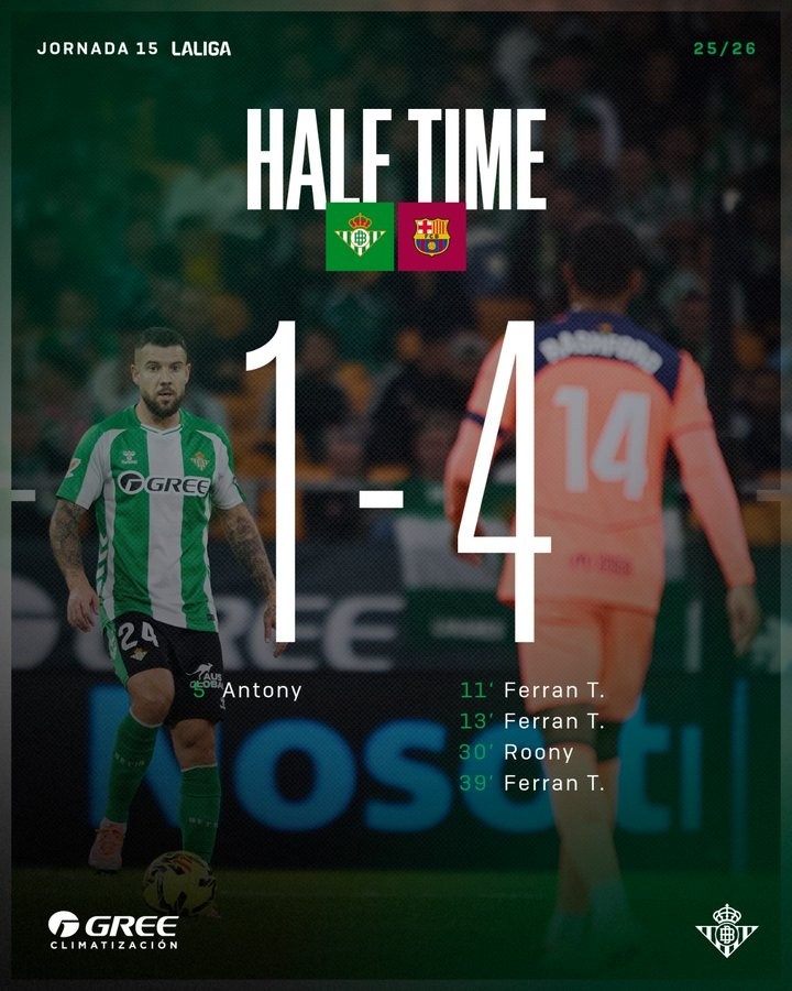 直播吧12月7日讯本轮西甲焦点战,巴萨上半场4-1反超贝蒂斯,数据统计显示西甲联赛历史仅有4支客队在皇家贝蒂斯主场上半场进球数达到4+:
