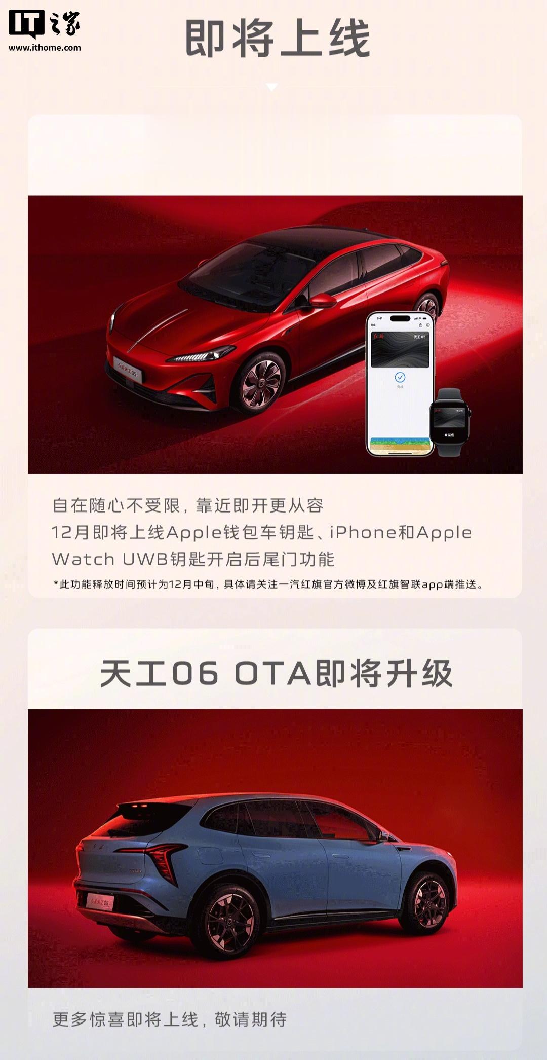 [一汽红旗天工05官宣12月上线苹果数字钱包车钥匙,支持UWB开启后尾门等功能]一汽红旗天工05昨晚官宣OTA全量推送就位,优化城市领航辅助/车道巡航辅助、升级AI大模型等。该车还将在12月上线苹果数字钱包车钥匙,支持UWB开启后尾门等功能。#一汽红旗#