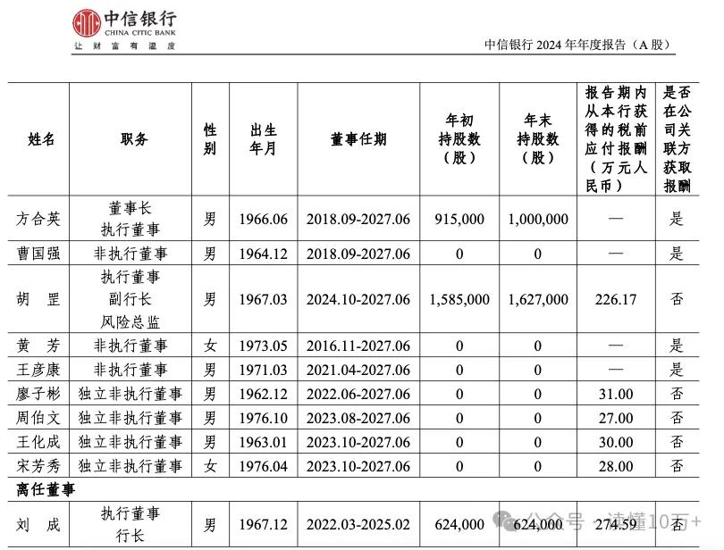 现中信银行已发布2025年三季报,根据2024年年报披露,董事长.执行董事方合英2024年税前报酬总额为0万元。执行董事.行长今年2月已离职刘成2024年税前报酬为274.59万元。远高于六大行行长薪酬,但也符合金融央企300万上限新规。
