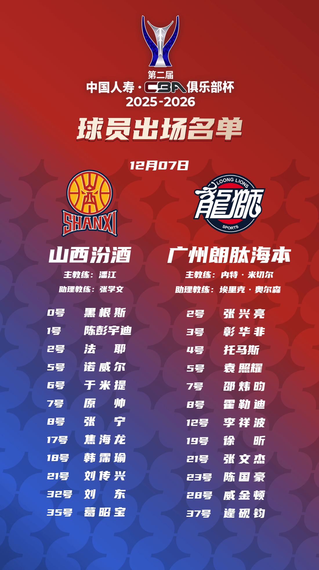 虎扑12月07日讯今日CBA杯,山西男篮将对阵广州。