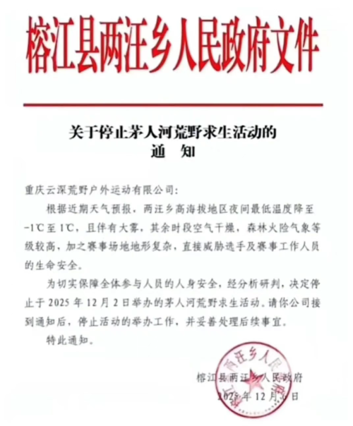 记者注意到,贵州榕江“荒野求生赛”于12月2日在贵州榕江县两汪乡正式开启。有媒体报道称,参赛报名费为1280元,共200个名额,吸引了4000人报名,冠军有10万元奖励。12月6日,比赛仅仅开赛4天后,网上便有网友晒出了两汪乡政府发出的一纸“停赛通知”,通知写道“根据近期天气预报,两汪乡高海拔地区夜间最低温度降至-1℃至1℃,且伴有大雾,其余时段空气干燥,森林火险气象等级较高,加之赛事场地地形复杂,直接威胁选手及赛事工作人员的生命安全。为切实保障全体参与人员的人身安全,经分析研判,决定停止于2025年12月2日举办的茅人河荒野求生活动。”