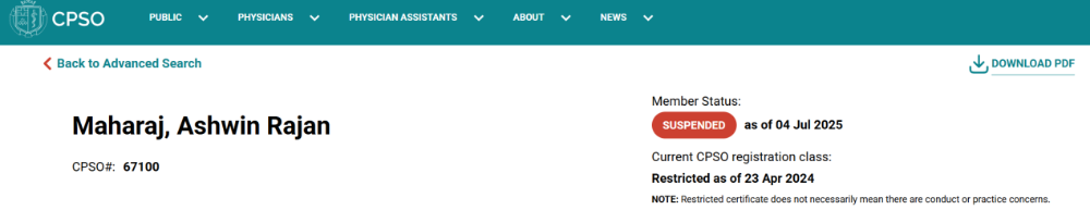 今年7月4日,基于多名患者指控,CPSO暂停马哈拉杰的执业资格,称此为“现有最严格的临时措施”。CPSO还将相关指控移交至安大略省纪律听证会进行审裁。