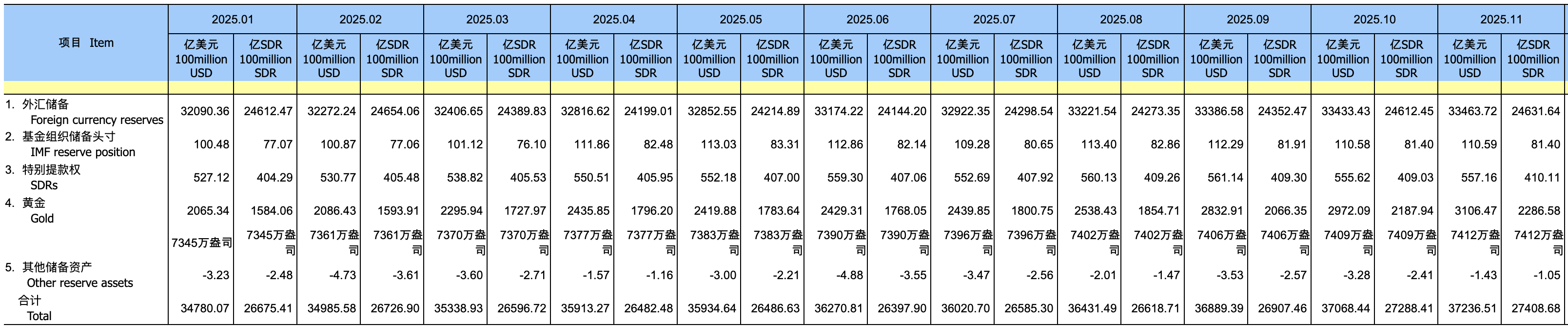 “11月,美国联邦政府重启后补发的一系列经济数据表现疲软,加之多位美联储官员发表鸽派言论,美联储12月降息概率已升至80%以上,美债上行、美元贬值,全球资产价格涨跌互现。”民生银行首席经济学家温彬表示,受资产价格变化与汇率波动综合影响,11月末外汇储备规模实现连续第四个月回升。