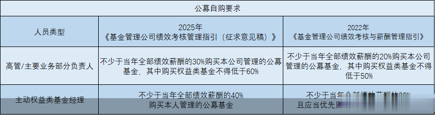 而此前发布的《指引》则要求高级管理人员、主要业务部门负责人自购比例不少于当年绩效薪酬的20%,其中购买权益类基金不得低于50%;基金经理自购本公司公募基金的比例则是不少于当年绩效薪酬的30%,且应当优先购买本人管理的公募基金。可以看出,《征求意见稿》进一步将高管、基金经理的自购比例提高。
