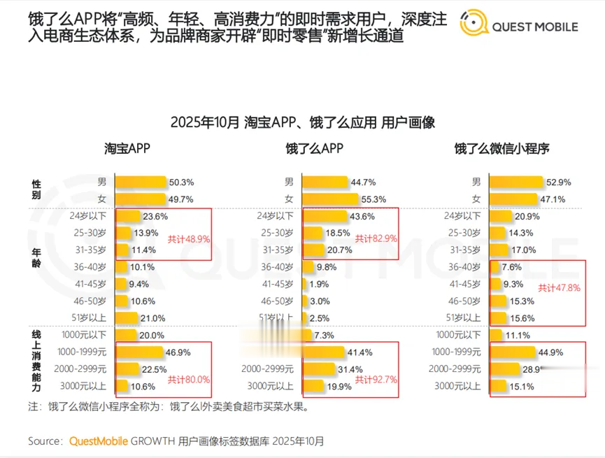 据QuestMobile报告显示,饿了么APP可以将“高频、年轻、高消费力”的即时需求用户,深度注入电商生态体系,为品牌商家开辟“即时零售”新增长通道。在双端协同下,淘宝APP的用户活跃增长逐步扩展至全天候时段均明显增长,更加侧面反映人们从外卖服务向即时零售的需求扩展。
