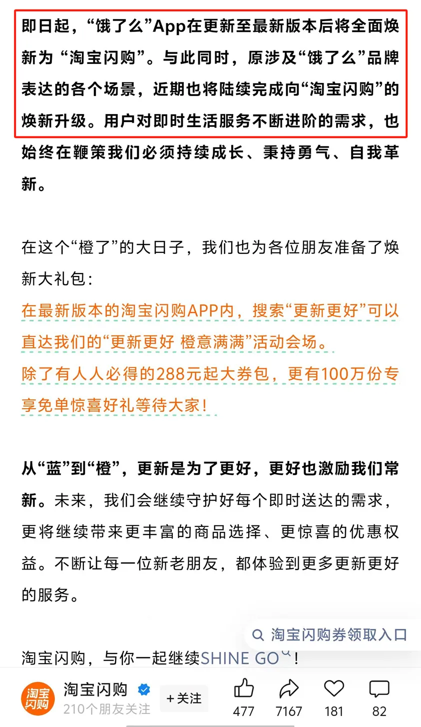 今日,饿了么正式发文宣布:即日起,“饿了么”App在更新至最新版本后将全面焕新为“淘宝闪购”。
