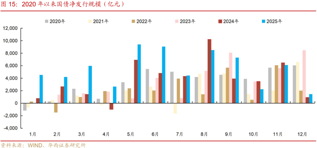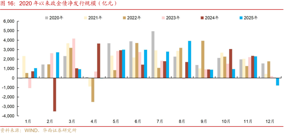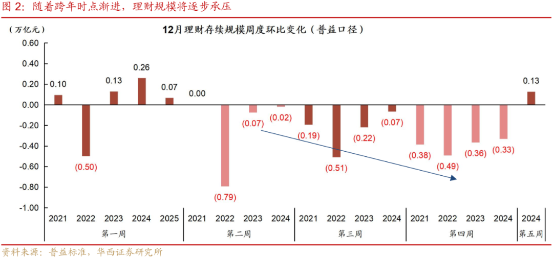 往后看,12月为传统季末月,随着跨年时点渐近,理财规模将逐步承压。参考历史回表节奏,理财规模降幅逐周扩大,自12月第二周起,规模开始逐步收缩,起初幅度较缓,单周降幅基本在1000亿以内;第三周压力初显,平均降幅升至约2000亿元;直至最后一周跨年时点,回表压力升至阶段性高位,周度规模降幅普遍达3000-4000亿元。