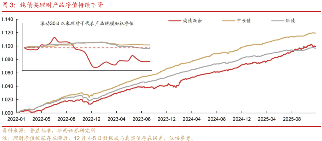 全部理财产品净值持续回撤,区间负收益率占比持续高于常规水平。12月1-5日,债市大幅调整使得纯债类产品净值回撤进一步扩大,其中短债类和中长债类产品周内最大回撤分别升至9bp和3bp。不过,随着权益市场小幅反弹,含权类理财产品回撤幅度有所收窄,周内最大回撤较上周降4bp至32bp。在此背景下,区间负收益率占比虽高于常规水平,但相较于上周下降8.95pct至15.02%。拉长期限来看,滚动近三个月产品负收益率占比仍在小幅上升,较上周升0.03pct至1.88%。