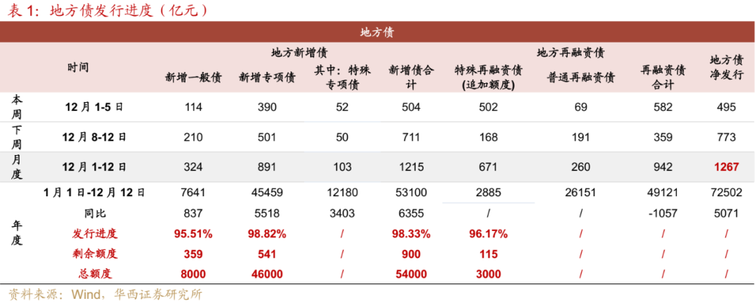 1月1日-12月12日,地方债累计净发行72502亿元,同比多5071亿元。其中,新增地方债累计发行占5.4万亿额度的98%,剩余额度901亿元。