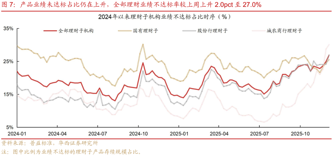 或受业绩表现滞后影响,产品业绩未达标占比仍在上升。全部理财业绩不达标率较上周上升2.0pct至27.0%。拆分各机构观察,国有行、股份行和城农商行较上周分别上升1.0pct、2.8pct和1.3pct,分别至25.5%、27.0%以及30.1%。