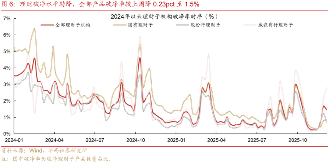理财破净率和业绩不达标情况易受产品过往业绩影响,2024年以来波动水平相对不大,同过往几轮赎回潮可比性不高,我们更加关注理财区间负收益率表现。