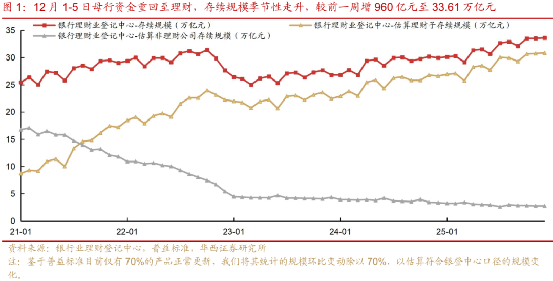 12月1-5日母行资金重回至理财,存续规模季节性走升,较前一周增960亿元至33.61万亿元。