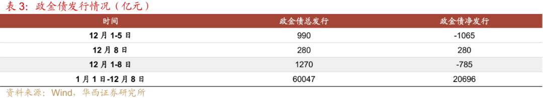 政府债供给小幅抬升。12月8-12日,政府债计划发行量为3905亿元,较前一周的3317亿元有所提升。其中,国债已披露计划发行2835亿元,此外,10日还将发行一只3M贴现国债(预估600亿),我们预计国债总发行规模为3435亿元(周环比+1205亿元);地方债计划发行1070亿元(周环比-18亿元)。
