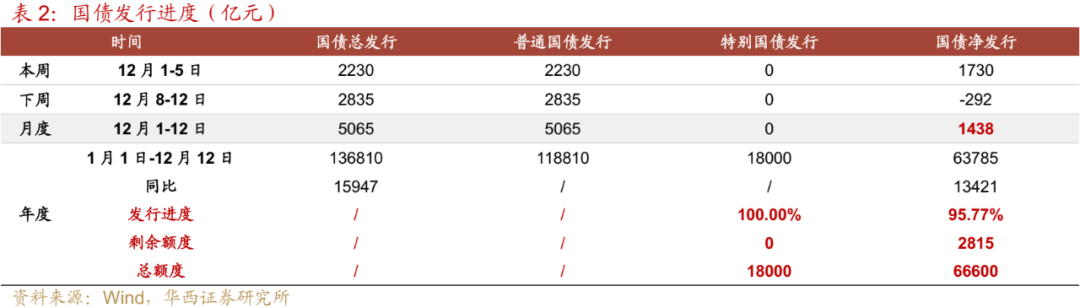 1月1日-12月12日,国债累计净发行63785亿元,同比多17952亿元,占6.66万亿额度的96%,剩余额度2815亿元。