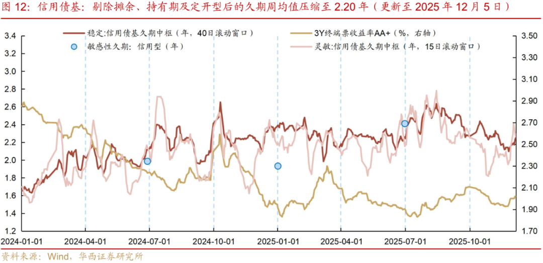 12月1-5日,债市走出先上后下的倒V形行情,利率型与信用型中长债基久期表现分化,利率型中长债基久期近五周以来连续压缩,而信用型中长债基久期则开始拉伸。根据稳定模型计算,利率型中长债基久期周度平均值由前一周的3.49年压缩至3.36年,信用型中长债基久期周度平均值则由前一周的2.13年拉长至2.20年。周内来看,利率债基久期为先降后升,由周一的3.44年降至周四的3.31年后,周五小幅升至3.35年。信用债基久期则先在周一至周三围绕中枢2.17年上下波动,随后大幅抬升至周五的2.25年。